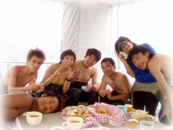 2005 6/18 おかえりなさーい。 気温30℃ 水温28℃ 南西の風 くもりちびっと晴れ間。 |
