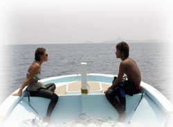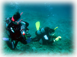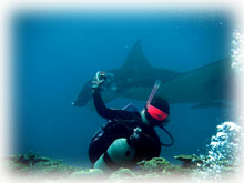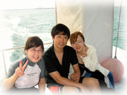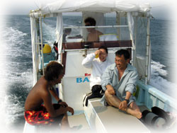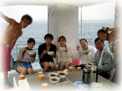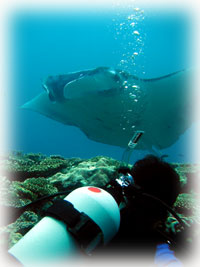 お昼を食べつつ、マンタの写真の出来が気になる・・・ぅ。と言うことで、帰ってログと写真をみましょー・・。ケイコさん、実は彼抜きで潜るのは初めてだそう、しかも・・マイデジカメも初体験。みんなで、ユカリさんやケイコさんの撮られた写真鑑賞会っっ。うまく撮れてました。ケイコさんは、その興奮が伝わってくる出来でした・・・。 |