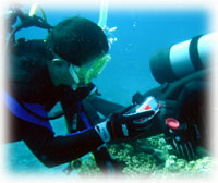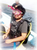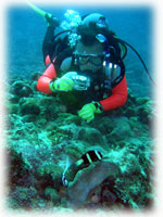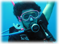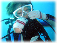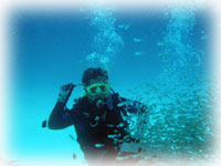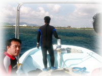 ウェットは窮屈で気持ち悪くなる・・と、Tシャツダイバーのカンダ氏。寒がりのワタシにはどうしても考えられない。