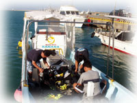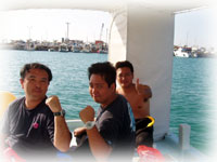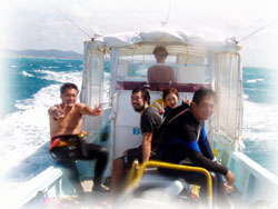 ちょっと待って下さいよー・・なくらい時化・・・。だけど、きのうに引き続き3本潜りますっのタナカ氏、サトー氏、トミタ氏。朝早めに出航して一本。