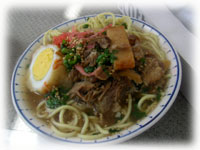 今日は、トロトロ煮込みソーキの乗った、ちほ特製八重山ソバとジューシーオニギリです。