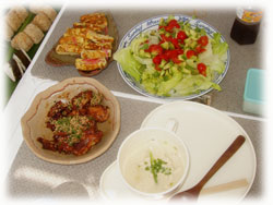 今日は、あつあつゆし豆腐、 鶏照り焼き、サラダ、卵焼き、 ジューシーオニギリなど。