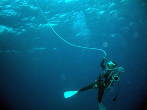 そして、ポイントに到着後、まずはダイブマスター候補生のヤタベさんとオオクボさんとワタシとで、ナビゲーションの直線リールを引いての準備。少し流れていて、お二人は四苦八苦・・・ののち、無事準備が出来ました。講習生の方にエントリーしてもらい、30m直線移動の課題からこなして頂きます。