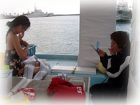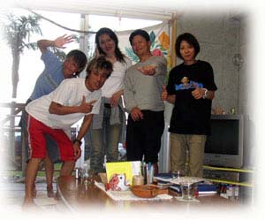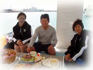 一本もぐって港へ・・・・。 そして昼にご到着のフジサワさんが加わりランチです。