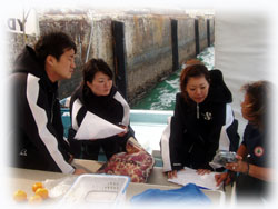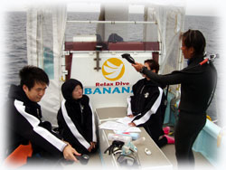 一本潜って・・・ ポイント移動・・・の前に、 次の講習「水中ナビ」のブリーフィングです。 まずはコンパスの正しい持ち方から・・・。