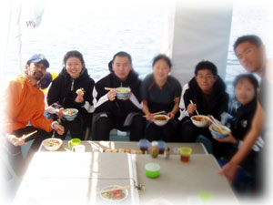 大崎を2本潜ってランチタイムでーす。 アツアツのソーキソバとおにぎり。