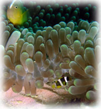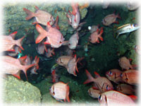 ココの透明度は・・・・。 でも、タッキーサンは「おもしろかったっ」と満足していただけました。ワタシはひとりでまたまた泳ぎまくりネタ探し。外洋を探索したり、ガレ場をひっくり返し(キンチャクガニとサンゴモエビのみでした)たり、じーーーっくりとニシキテグリを観察。シャッターを切ったモノの・・・残念・・ピンがあってませんでした・・・くぅぅ。