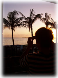 ログ付けが終わる頃、ちょうど夕日が沈む頃。 お店から竹富島に沈んでいく夕日を見ながら、 「ホントに非日常ですねぇ・・海が見える生活。いいなぁ・・・・ 」と。 そういえばそうだ・・・。 ワタシタチにはすでに日常になっている、 この時間も場所も風景も、 内地の都会で暮らすヒトにとってはとても非日常。