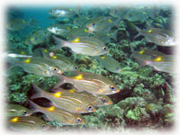 黄色い点が光るノコギリダイの群れ。