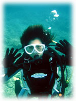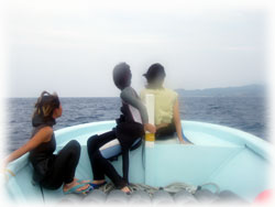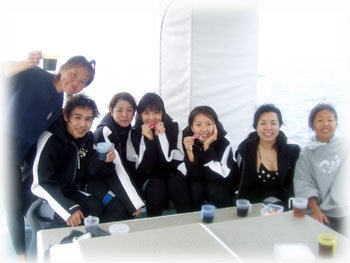 今日は昨日より、少し暖かい気が・・・。とおもいつつ、出航です。今日のメンバーは、きのうにひきつづき、カヨさん・ユカさんの仲良し姉妹と、本日到着のヤスコさんとマサヤさん(←15分しか寝てないらすい・・・)そして、5年ぶりの体験ダイブに挑戦・・・はマキコさん。今日は体験ダイブをヘルプできてくれたキヨチンがマンツーマンで担当してくれまーす。。