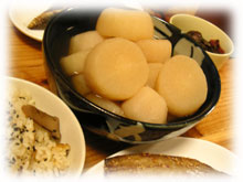 まずは、とぎ汁の変わりにお米を入れたお湯でゆでこぼした後、先日、東京でお世話になったオオクボさん・ホシさんから頂いた「焼きあごだし」(←トビウオ)を使い、こっくりと薄味で煮ていく・・・。