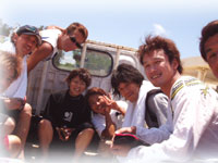 トラックの荷台でおソバを食べに向かいます。たのしーーっ。みんなとってもいい笑顔。