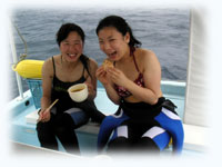 天気が悪い一日でしたが、思い切り楽しんだお二人・・・・。体験ダイブをしたサトコさんは、実は乗馬のインストラクターでした。運動神経抜群?。次はもうダイバーになって戻ってくる気満々・・・。幼いときからの友達で気を遣わなくていい関係の二人。一緒にダイビング出来たらいいねっ。