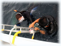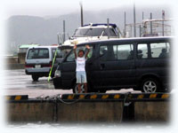 今日のゲストさんは、ダイバーさんのシナノさんと、潜るの初めて〜な体験ダイブのサトコさん。元気よく登場です。しかし、ワタシは・・・お見送り。とにかくお店の事務処理のシゴトが山のようで、ニッチもサッチもいきません・・・。ワタシの変わりに来てくれたのは、かっくいいヘルプ・・・マッシーっ!!今日は、かっくいい?イントラ2人とゲストのお姫様ゲストお二人で出航です。。マンツーマンなので、何でもワガママ言って下さい。雨の日のお姫様ダイブです。