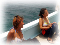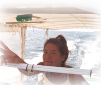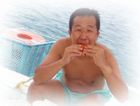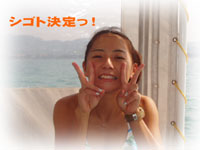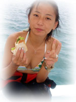 今日はピーカンの予感。にぎやか満員も一段落・・・。と思いきや、朝早く地元のナース、サトコちゃんから電話。「今日もぐれますかぁ・・・?」「タンクがあれば潜れるよー後で折り返し電話入れるね」「いゃ今まだシゴト中なんです」「!!夜勤明けで来るのおー??」・・・。先日台風で予約はオジャンになったし、天気が良くてウズウズしたらしい・・・地元に住んでるとお得。。てなわけで、今日のゲストは、夜勤明けのナースサトコちゃん、そしてこれまた地元に住んでるユッカちゃん、そしてそして、5月に来て下さって、またの来島のフクマ@ルートビアフリーク さんの3人様です。ちょっといつもより広い船内で、なんだかワタシもピクニック気分。