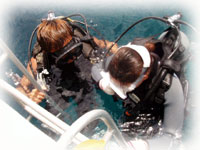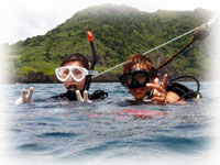 水面に上がったら、ブリーフィングとシュノーケリングの練習を終えて、ダイビングに挑戦のキリムラさん達が・・。 |