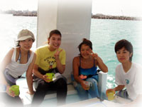 今日は、なぜだかみんな忘れ物する日?まず、竹富に泊まって竹富から来たナオコさん。携帯を民宿に忘れてしまったコトが発覚。宿のヒトが携帯を船に乗っけて届けてくれるとのことでほっと一息。そして忘れ物その2っ!、さとこちゃん。あれれ・・・マスクがナイ・・。メッシュにマスクがありませんでした・・・。そして、忘れ物その3。出航前、いつも買う氷をウチノヒトがすっかり忘れてたっ!!