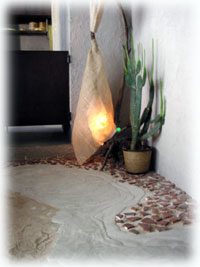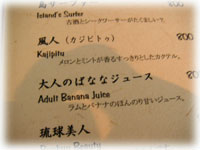 しつこくないスッキリとしたアジアンインテリアが心地いい空間です。メニューもなんだか興味をそそられます・・。ほとんど呑めないワタシは中国茶やばななジュースが気になるぅ・・。フロアには、ビーチサンドが・・・。なんだか裸足になりたくなってしまいます。まきちゃんは、以前よりずいぶんゲンキになった様に見えました。イイコトもあったみたいで・・何よりです。オアイソの時、オーナーの方に同じ「