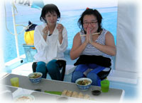 今日の石垣島、風がない・・・。そして、とってもいい天気。お店から海を見ると、たいらーーーぁな、ベタナギ。そう、今日の海は、よさげ・・・な日に限ってワタシはお店なのだ。必ず、しっかり、いつもそうなのだ。なぜ? 明日から始まる親子オープンウォーター講習の準備をワタシはお店でやりまする。そして、今日のラッキーゲストは、きのうに引き続きの関西のオッサン(・・自称ですぅ・・・・)・・ぃゃ関西の女性お2人、フミコさんとミユキさん。