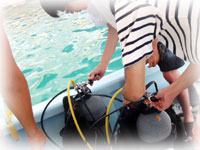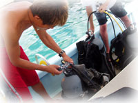 まずは港で器材のセッティングのやり方から。今回の講習担当は、久しぶりにウチノヒト。