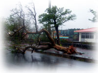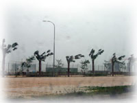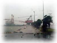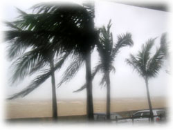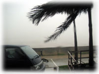 とにかく、目の前の海は真っ茶色そして、椰子の木は、おれそうなくらいシナって揺れています・・・。いろんなモノがぴゅぅぅぅぅーーーん、とスゴイスピードで飛び、おそろしい光景です。
