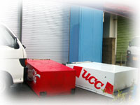 風上に向かって停めている車。ドンドン後退している気がシマス・・。あわてて、ウチノヒトが暴風の中、ブロックでタイヤ止めをかましました。いゃー、おそろしい。