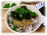黒米の入ったホカホカご飯に、ごま油でカリカリに焼いたちりめんじゃこをタップリ。その上から、すりごま、そして刻みネギ、そして韓国のりをトッピングして、醤油を少し・・・。シンプルだけど、これって絶品です