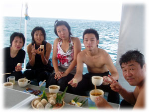 にぎやかなシュノーケリングを終えて、まずは腹ごしらえ。 ランチタイムでーす。