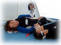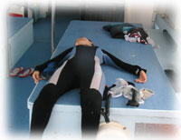 残念ながら、カワクボさんはグロッキーノックアウト状態が続き・・。聞くところによると、睡眠不足気味とのこと・・・。カードを取って2年間、潜らなかったのは、講習で恐い思いをしたから・・と言うことで、ぜひ、このファンダイブでいい想いをして欲しい・・と思ったけれど、コンディションに恵まれませんでした・・・。ぶっ倒れながらも、ずっと悔しがっていたカワクボさん。でも、また来ますっ!というコトバに、ワタシも少し救われました・・・。また絶対きてくださいっ!