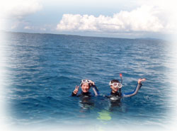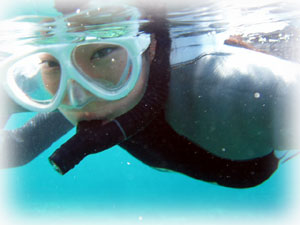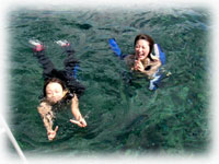 黒島に到着。お二人は、水が恐い・・・。 ウェットスーツは水に浮くよ・・と聞いて少し安心??