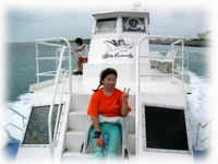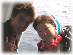 台風21号は停滞してたけど、動き出してまた久米島の方へ戻って行きました・・・。これから、本州に上陸しそうな勢いです・・・。お気をつけ下さーい。 朝はまだ波が高めなので、少しおさまる午後からの出港となりました。今日は、快適に潜って頂くために、大きな船に乗り合いました。今日のゲストは・・・台風で結局来れなくなってしまったゲストが2組いらっしゃったため・・ナントその中でも強運の持ち主、お一人のみ。きのう飛行機飛ばないかも・・・と言いつつ、自分は強運を持ってるから多分ダイジョウブ・・とおっしゃっていた通り、きのう石垣島無事到着されたサイジョウさん。初めに予約をしようと思ってた直行便は欠航したとか・・。ホントに運が強い。 。