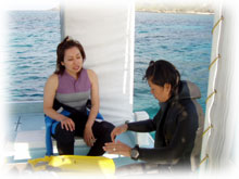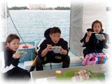 そして、ワタシとダイバーのウエダさんとミヤタさんは、船上でユンタクゆんたく。 |