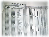 みんなが感心・・・。 ハルオサンのすべてのダイブ歴記録表。 今までのポイントや最大水深、ガイド名まで コレ一枚でスグワカルのだっ・・。