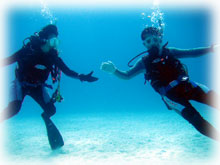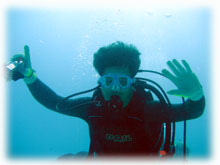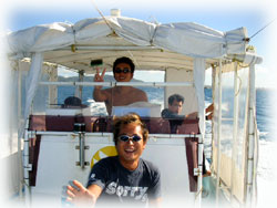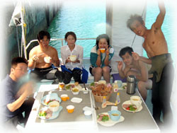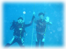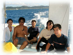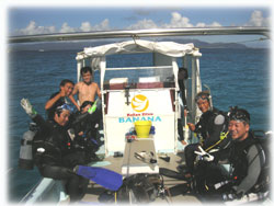 | いいお天気の今日のゲストさんは・・・3日に潜る予定だったのに・・台風19号が島にぶち当たり・・急遽日程をずらして今日のご参加になったタカダヒロアキさん・チアキさんご夫妻。そしてカワダケイイチローさん・アキコさんご夫妻の4人さん。。そして今年3月、そして6月に来て頂き、今年3回目のヌノメさん。。そして地元にお住まいのナカムラさん。ナント・・ナカムラさんはイントラさんでっす。。台風に当たってしまったアンラッキーの厄落とし・・・??今日はお天気が良くて気持ちのいい1日。最初にポイントのリクエストを皆で話しあい、今日は離島方面への出港となりました。大阪に行ってるワタシの代役ヘルプスタッフ・・はオオトモくんです。。