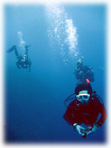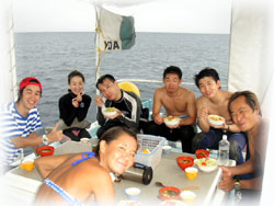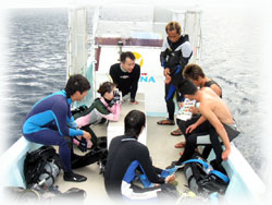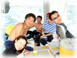 そして・・・空港に到着されたゲストさんと合流し、揃って出港で〜す。合流したゲストさんは、昨日に引き続きのケンゴくん。昨夜は4時まで深酒していたらしく反省モードです・・・。そして、今年のG.Wに来て下さったクミコさん。今回はダイバー友達のカスガさんといらして下さいました。。そして去年の10月に来て頂いたモリさんのダンナサマ、タツヤさんが来て下さいました。今回、奥さんもご一緒に来島されているのですが・・・ナント12月にご出産予定だとか・・。おめでとうございまーすっっ。そして、おととい潜って頂いた地元イントラのナカムラさんがまた来て下さいました〜。。。