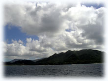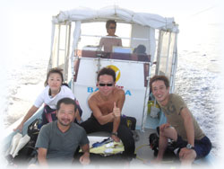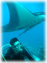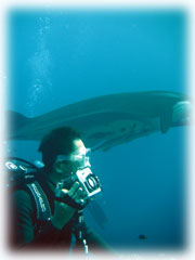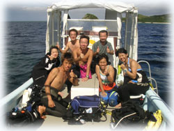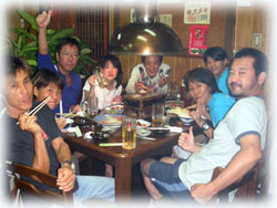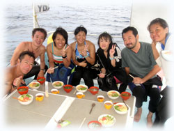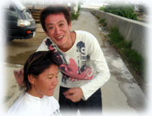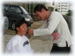 カそして、今日、船上ヘアカット予定(水中カット・・というハナシもあったらしい・・危ない危ない)が・・・ハマダさん、ハサミを忘れてしまったので出来ず・・急遽夕方、ログ中お店の前で、夕日を見ながらヘアカットしてくれました〜。
