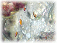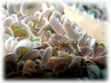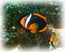 まだ2本の白線のハマクマノミ幼魚。