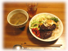 このところ毎晩気が付けば・・・21時っ。 「さぁ、ゴハンどうする・・てな具合だったので、 これはいかんと今日は8時頃から買い物に行って スグ出来るロコモコにしました。 ボリュームつけすぎて、ワタシは食べきれなかった・・ 。