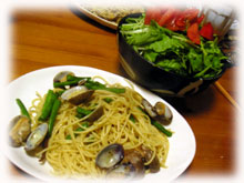 本日の晩ゴハン。 ・インゲン豆とアサリとバジルのあっさりパスタ