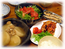今日の晩ゴハン。 ・ホタテと一緒に煮たフロフキダイコン ・タンドリーチキン ・水菜とトマトのサラダ ・鮎の塩焼き
