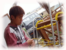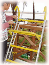 雨が降ってるので、船のハシゴを持って帰ってきて 滑り止めのロープを巻き付けていきます BANANAカラーのイエローハシゴになりました。 ずーーとオープン以来、やろうやろう・・と思いつつ、手をつけてなかった・・・。