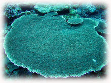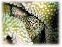 ヘラジカハナヤサイサンゴの模様に擬態しているセダカギンポをよーーく観察。