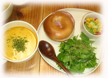 今日はパスタ入りパンプキンスープとベーグルサンド。