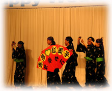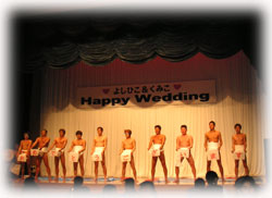 宴会場に舞台が普通にあり、花嫁花婿の席は反対側に。まるで舞台が会場に2つあるようです(どっちがメイン?)。祝辞に続き、舞台では同級生や仲間達などが、プログラムに添って余興を繰り広げていきます。琉球舞踊あり、エイサーあり、寸劇有り・・・・・・まるで学芸会の豪華版。そして、ウチノヒトも、ダイビング協会の先輩有志の人たちと一緒にフンドシで舞台に上がってました・・・(先日シゴトの後、みんなで深夜まで練習したそう・・)内地では、結婚式に呼ばれてフンドシで舞台に立つナンテ事はまずナイでしょぅ・・・・。