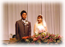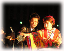 噂に聞いていた島式の披露宴・・・。招待客は300人・・このくらいが普通だそうです。しかも、島では招待状は「全部手渡し!」なんだそうです。確かに数日前、シゴトを終えたヨッシーがウチにもわざわざ来てくれた・・・。ウエディングドレスのクミさんはとてもキレイで、ヨッシーもかっちょいい。でも、お色直しの琉球衣装が、2人とも一番ステキでした・・・いいなぁ・・。
