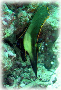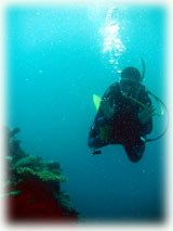 みんなコブシメが見られて満足〜な一本を終え、うねりを避けて名蔵湾へ移動です。お昼にするには中途半端な時間だったので、みんなにランチか潜るか聞いてみた結果、先に潜るとの結論。ブリーフィングをしてエントリーです。。