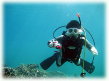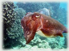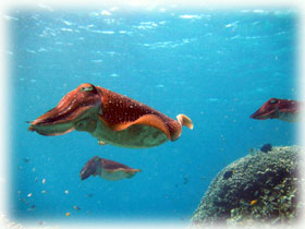 まずは深場でイエロージョー君を撮ってもらい、テラスのあたりで小物探し。今日はみんなに見てもらいたかったミナミハコフグの幼魚がいなくて残念・・。色んなモノを観察してから、今度は浅瀬へ行ってみんなでジックリ・・・ハナゴイやキンギョハナダイ、アオリイカ、そして・・コブシメの産卵や、オスがメスを取り合っている風景を観察することが出来ましたっ。ただ・・風邪気味のモモちゃん・・・やっぱり耳がぬけなくって、途中でシュノーケリングに切り替え。でも、コブシメの産卵をちゃんと見ることが出来たよー。。