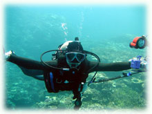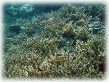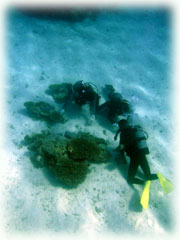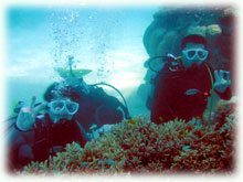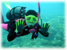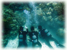 ココでは、まずシュノーケリングと体験ダイブチームはマッシーとシュノーケリングをやりました。ダイバーチームは、ワタシとウチノヒトの2チームに分かれてファンダイブ。ヒロアキさんは、カメラを持って撮影ダイブです。透明度が悪くて残念でしたが・・・ココは、リーフに囲まれて波が入ってこないため、色んなサンゴがスゴイ豊富で見応えタップリです。