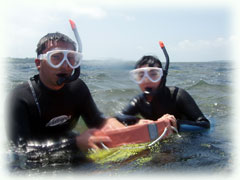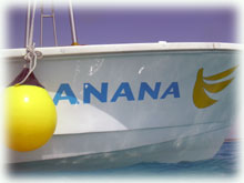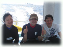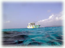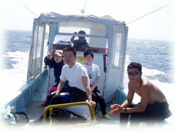 その間、初めての体験ダイブやシュノーケリングにご参加の、モリグチアキラさん・マユミさんご夫妻、そしてムラオカさんは、今日お手伝いしてもらうマッシーからブリーフィング説明を受けて万全っ。ワタシは、ウエダヒロアキさん、チヅルさんご夫妻をお迎えに行きました。ご夫妻のお子さん海人くんを保育園に預けて・・・港へ。一本潜って帰ってからみんなで合流し再出航でっす。今日は南風が強いので、まず向かったのは小浜島近くのポイントです。、