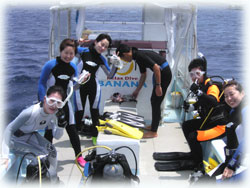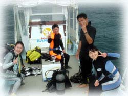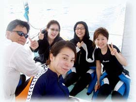 まずは、昨日に引きつづき、ヒロさんとメグミさん、そしてムラタさん。そして今日から登場のミワさん。前回去年の11月に潜りに来て頂いて以来デス。そして、去年は7月、そして10月に来て頂いたクミさんもオヒサシブリブリっ。なんとデジカメを新調して登場。。(クミさん10月は台風の為、潜れませんでした・・・)まずはこのメンバーで朝から出航です。ワタシは・・・去年の寒い年末に来て頂いたゲストサンをお迎えに空港へ・・・。今日はマッシーがヘルプで来てくれました。